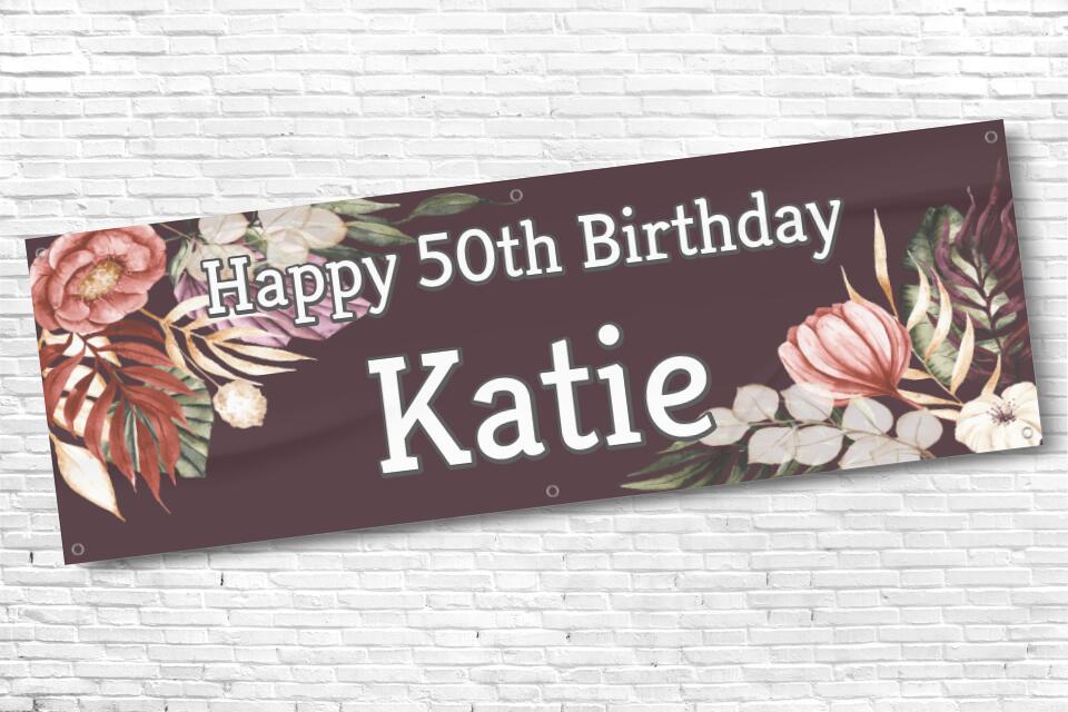 Ladies Personalised Maroon Corner Floral 50th Milestone Birthday Banner