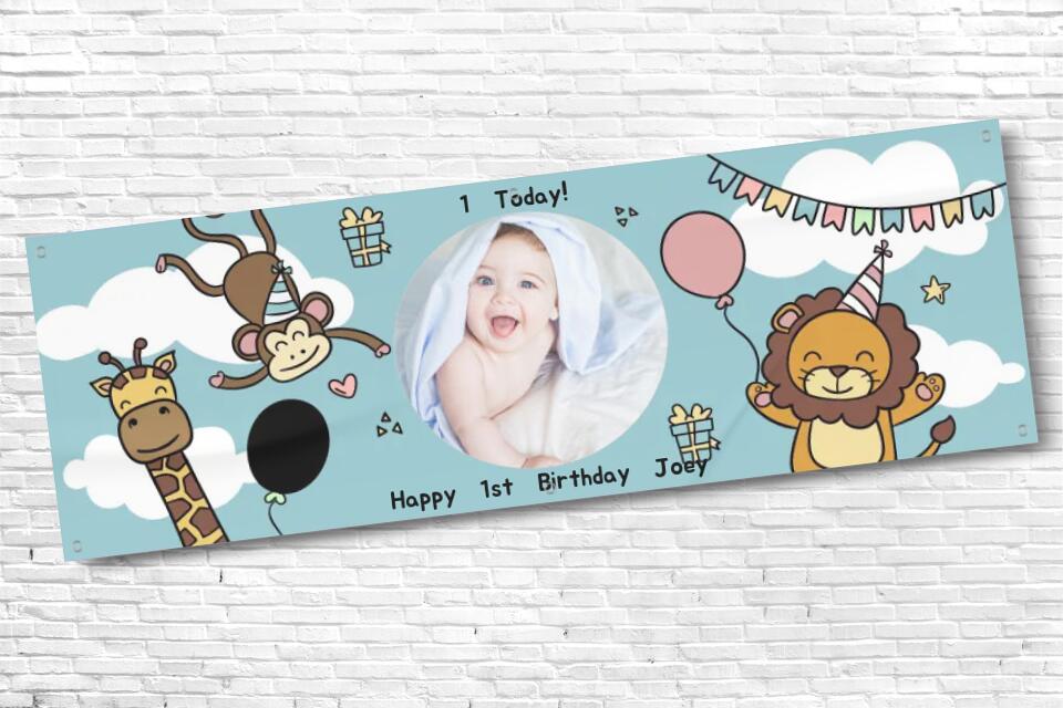 Personalised Boys Blue Animals Birthday Banner with any Text and Photo